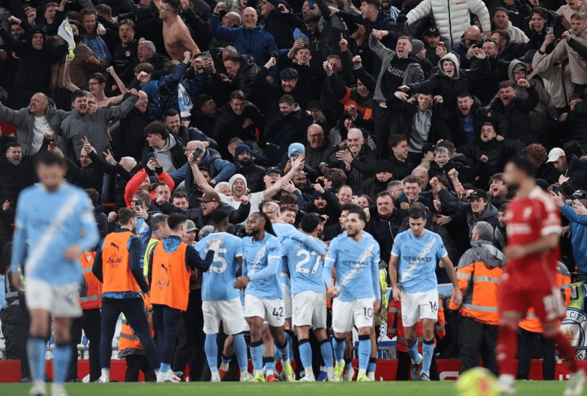 补时阶段利物浦送给曼城一个点球机会。哈兰德主罚命中,完成绝杀,脱衣狂欢。索博斯洛伊最后时刻因为破坏绝对进球机会被罚下。最终利物浦1-2输给了曼城,输球又输人。这是利物浦本赛季英超首次在领先的情况下输球,同时也是利物浦自从2017年4月以来首次在英超主场先进球后被逆转。曼城拿下这场关键战役,保留了争冠悬念。曼城目前落后阿森纳6分,排名第2。